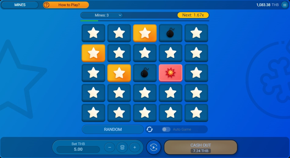 | ✨ ระวังระเบิด | หากเพื่อน ๆ คลิก/แตะไปเจอช่องที่มีระเบิด เกมก็จะจบลงทันที และจะเสียเงินเดิมพัน รวมถึงเงินรางวัลที่แสดงในช่อง Cashout ด้วย |