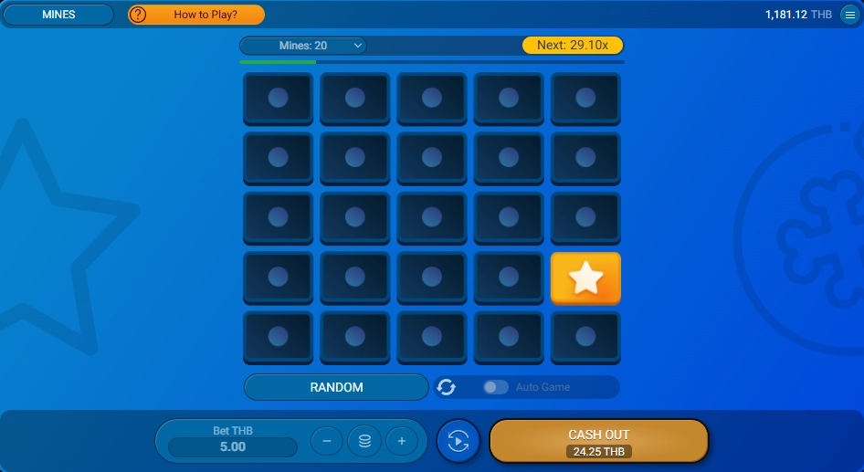 | ✨ หน้าตาเกม | เกม Mines จะมีตารางสี่เหลี่ยมเล็ก ๆ 25 ช่อง ซึ่งเปรียบเสมือนเหมืองแร่ โดยแต่ละช่องจะซ่อนดาวและระเบิดอยู่ในนั้น |